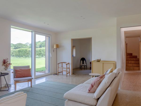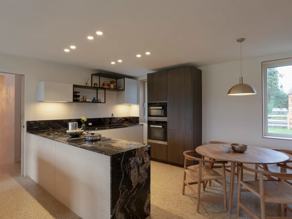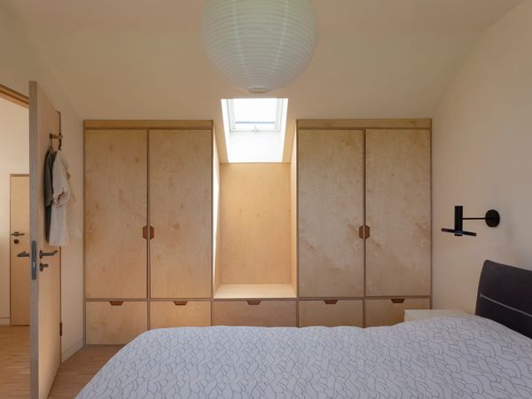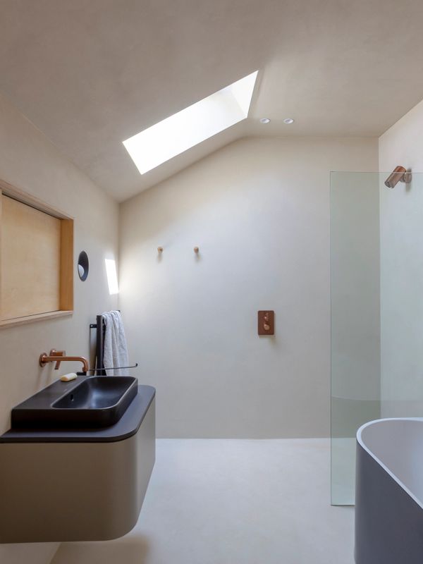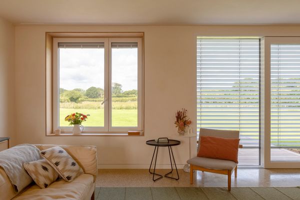 and construction phases – where the owner oversaw the build herself despite being complete self-build novice! The insulated raft substructure and twin-stud timber frame were supplied and constructed by MBC Timber, while triple- and quadruple-glazed Internorm windows with integral blinds were used to manage heat losses and gains via the predominantly west-facing facade. The interiors feature polished concrete and oak industrial parquet floors, combined with lime plaster walls, microcement wetroom linings and birch plywood joinery to create calm and contemporary spaces that the client loves.